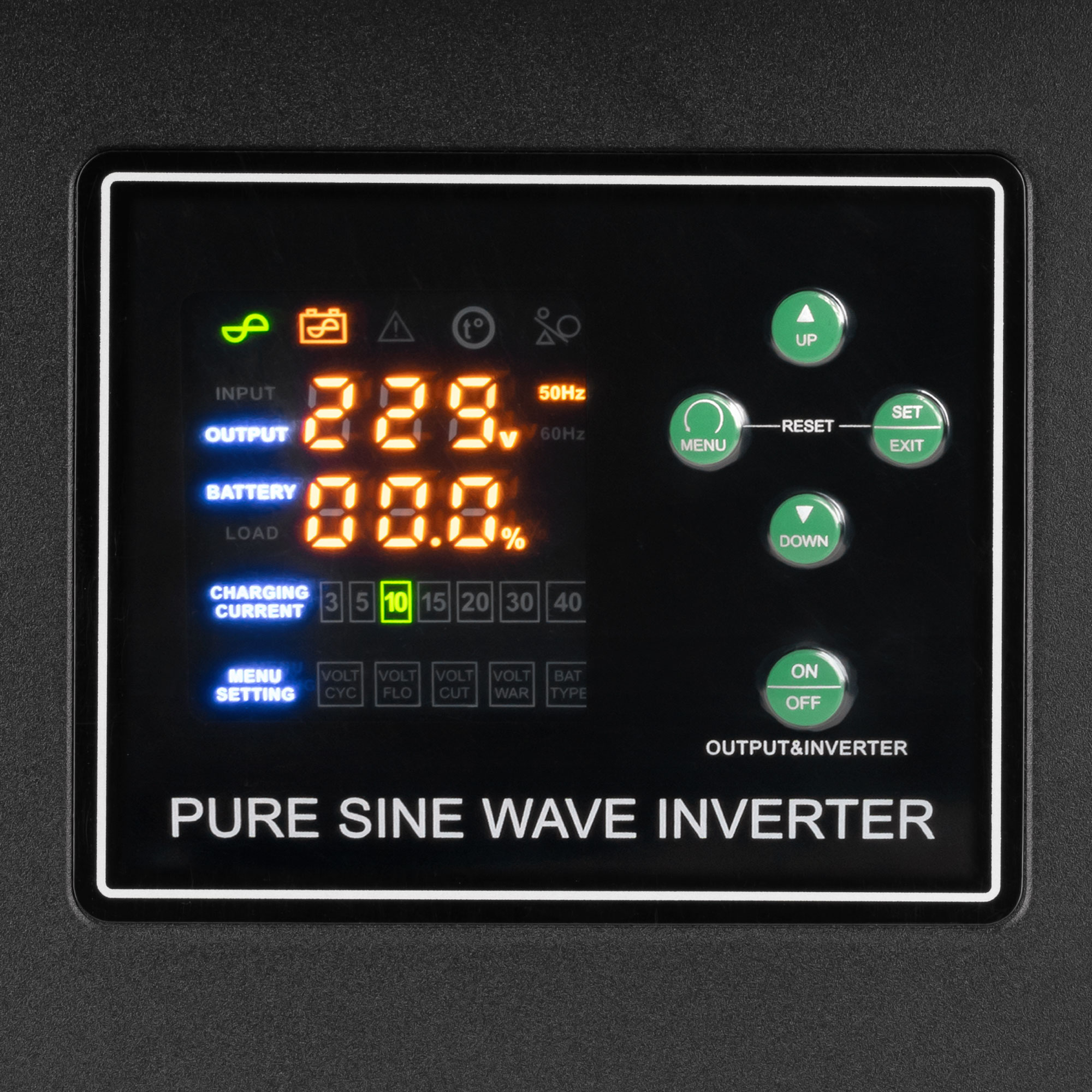 UPS-urile PRO Sinus de la KEMOT sunt echipate cu un afisaj LED clar care arata starea curenta de functionare a dispozitivului. Pe ecran puteti verifica, printre altele tensiunea de intrare, tensiunea de iesire si frecventa. Mai mult, puteti verifica rapid nivelul de incarcare la iesirea UPS-ului si nivelul de incarcare a bateriei.